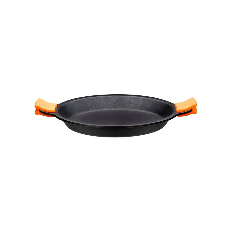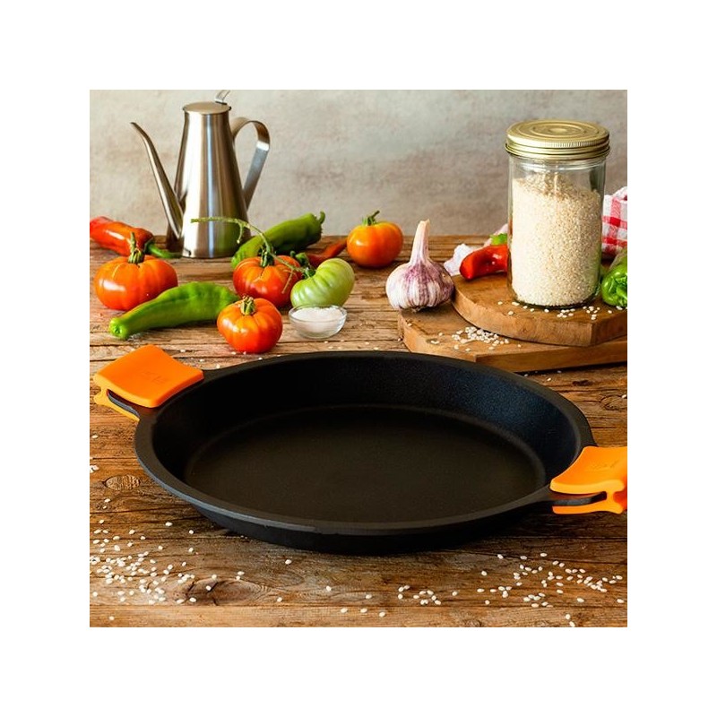 Incluye dos asas de silicona en color naranja para coger la paellera con comodidad.
