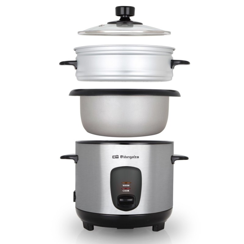 En su presentación, el cocedor de arroz de Orbegozo trae accesorios muy útiles. Entre ellos están un vaso medidor, una cuchara especial de arroz y una vaporera de vegetales.