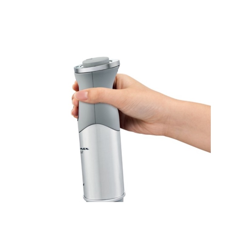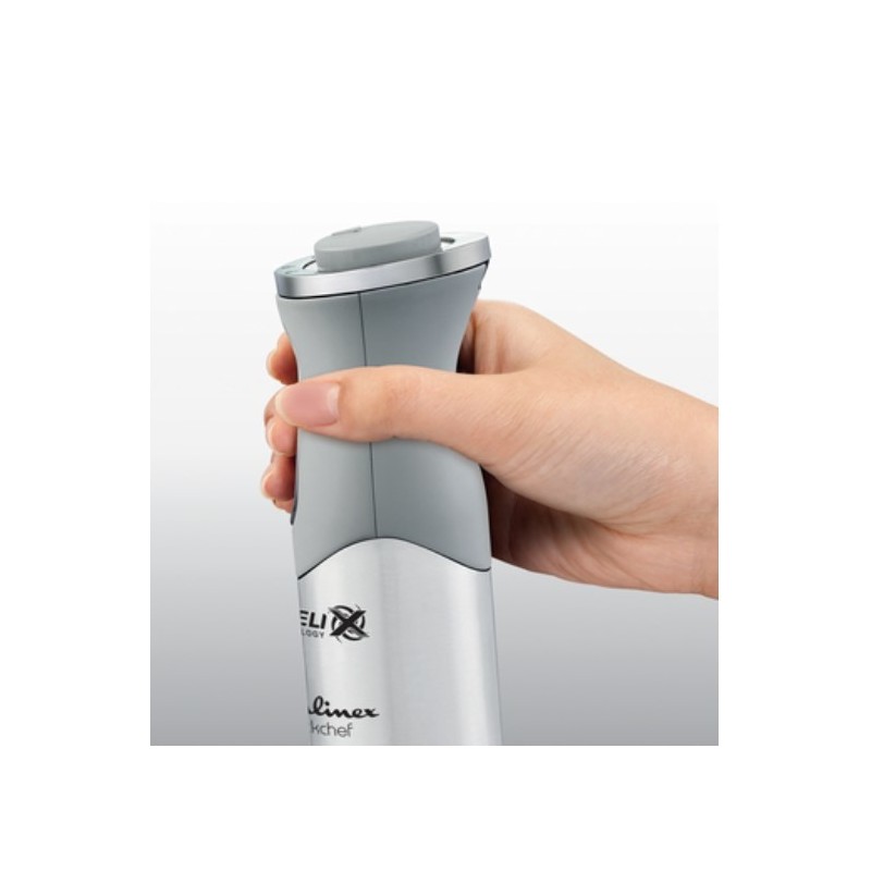 QUICKCHEF 1000 W (SIN ACCESORIOS)Gran potencia, mínimo esfuerzoCon la batidora de mano Quickchef de Moulinex disfrutarás de una potencia óptima sin hacer ningún esfuerzo. Prepara fácilmente una gran variedad de platos en un instante gracias a la exclusiva tecnología Powelix y al motor de alto rendimiento de 1000 W. Mantén siempre el control con las 10 velocidades que pueden regularse con un botón intuitivo y fácil de usar sin necesidad de parar la batidora. La protección antisalpicaduras y el mango antideslizante de esta batidora de mano le confieren una gran comodidad de uso, mientras que las piezas, aptas para el lavavajillas, facilitan su limpieza.