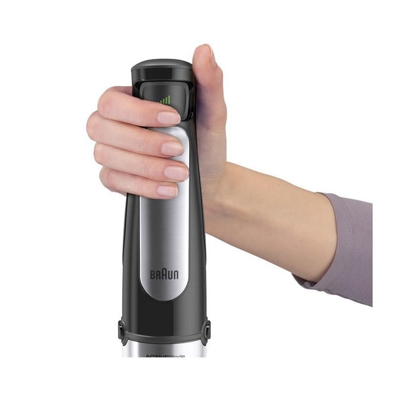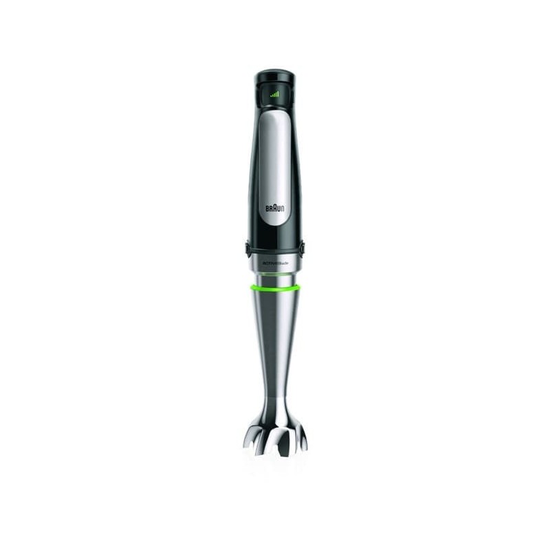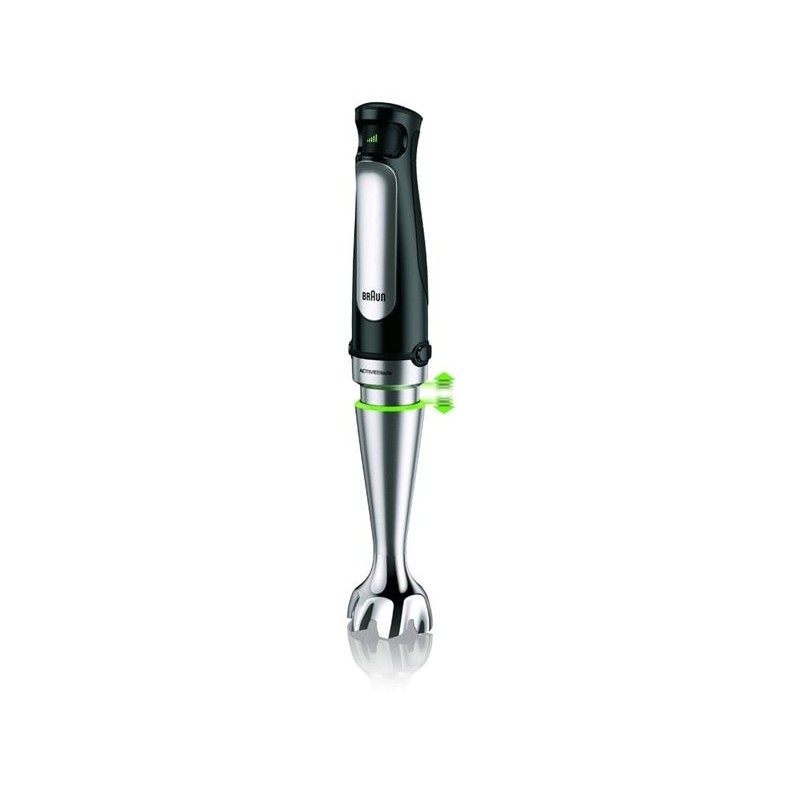 Tecnología ActiveBladeLa innovadora tecnología ACTIVEBlade hace que las cuchillas bajen y suban permitiendo así una mayor eficacia incluso con los ingredientes más difíciles e invirtiendo un 40% menos de esfuerzo* ya que hay 2,5 veces más de zona activa de corte. * Comparada con las batidoras de brazo Braun sin tecnología ActiveBlade.