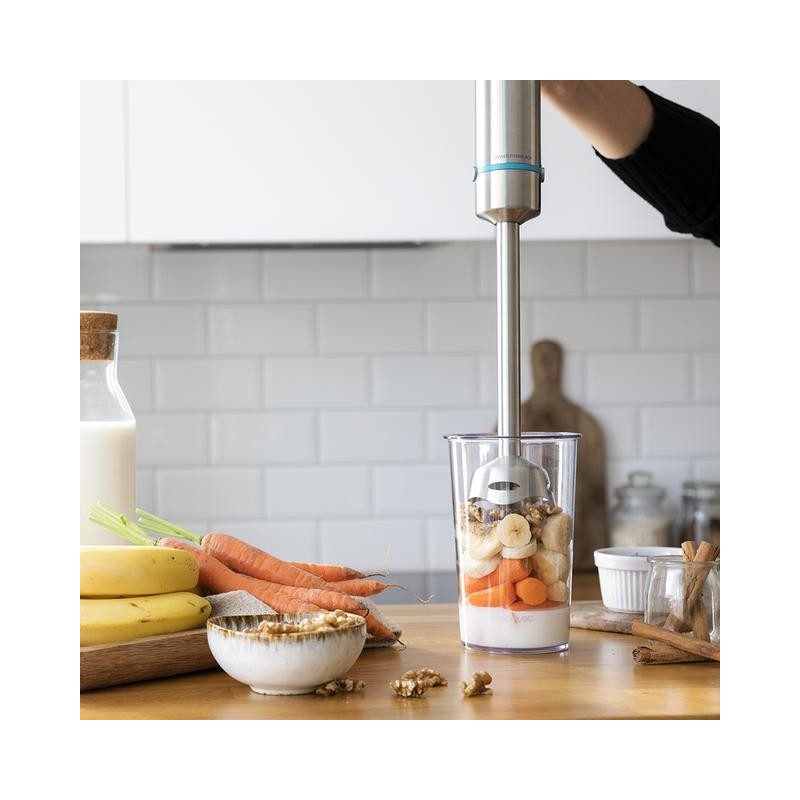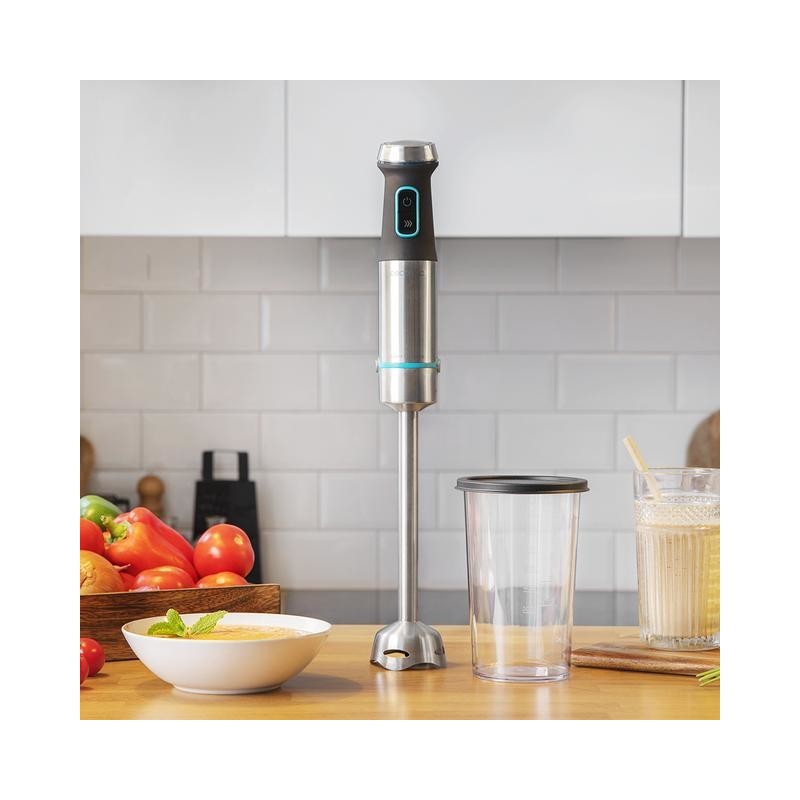 Campana antisalpicadurasSu campana con diseño antisalpicaduras permite batir y triturar de forma más limpia al evitar salpicar el área de trabajo. Su vaso de 800 ml con tapa te ayudará a preparar todas tus recetas y guardarlas en la nevera hasta que tú decidas.
