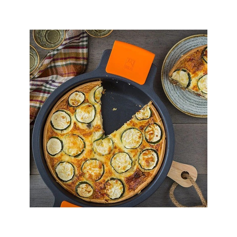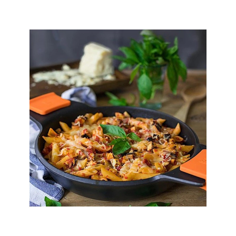 Incluye dos asas de silicona en color naranja para coger la cacerola con comodidad.