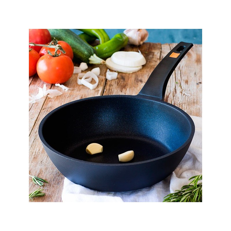 La sartén honda es de lo más práctica y versátil. Perfecta en su uso como sartén para cocinar a la plancha o dorar tus carnes, verduras o pescados, resulta ideal como wok y como cacerola baja con la que elaborar todo tipo de recetas, tanto platos sencillos como unos garbanzos con chorizo, unos fideos chinos fritos con gambas y verduras o un arroz caldoso de pescado, como para preparar unas sabrosas albóndigas con guisantes, pollo al ajillo, un estofado de ternera con champiñones o una deliciosa menestra de verduras con un pellizco de pimentón picante. Sus paredes altas la hacen ideal para tus frituras, evitando salpicaduras y ofreciendo una capacidad perfecta para poder freír con comodidad. Tanto unas croquetas, los buñuelos de la merienda o unos aros de cebolla, como unos calamares a la romana, nuggets de pollo, unas patatas bravas o unas piruletas de queso camembert con un poco de mermelada de tomate, quedarán perfectas y muy crujientes. Su versatilidad la hace ideal además, para cocinar el relleno de los canelones o de la lasaña, un rico pisto de verduras para acompañar unos lomos de bacalao, la salsa boloñesa para la pasta o la bechamel de las croquetas. Cocinar con ella de forma eficiente y con grandes resultados es, además, una experiencia muy agradable. Y gracias a su revestimiento antiadherente de alta calidad en el que no se pega nada, su limpieza es de lo más sencillo.