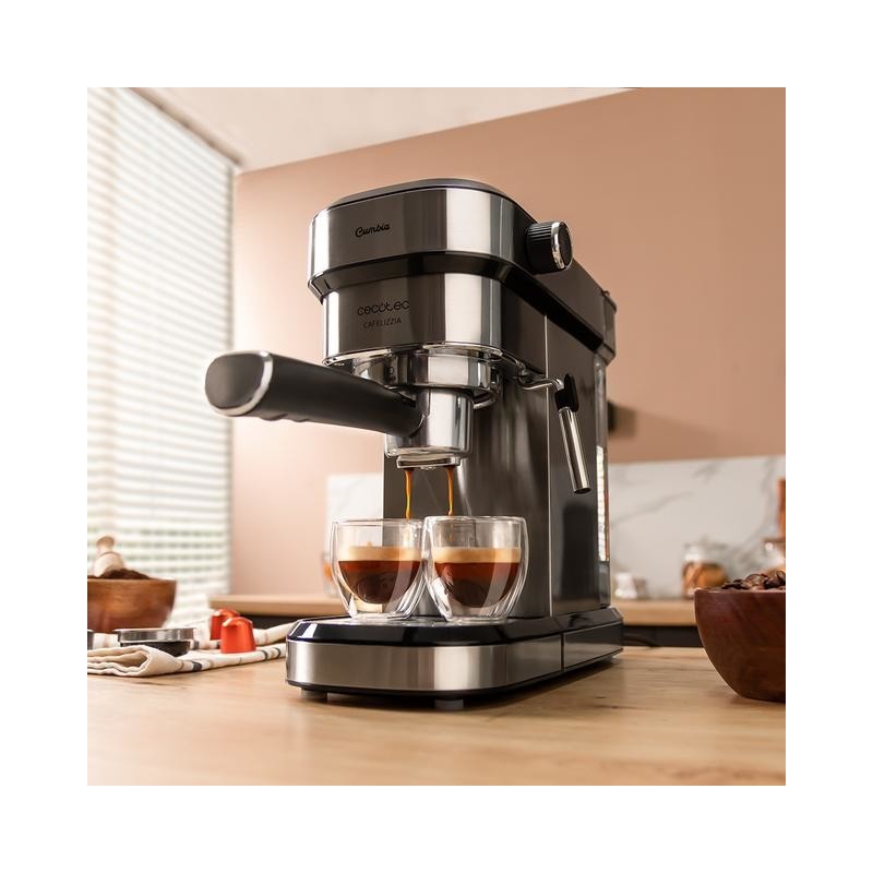 - Cafetera espresso con diseño elegante y compacto para los amantes del buen café. Permite hacer todo tipo de cafés con una potencia máxima de 1350 W y también emite agua caliente para infusiones.