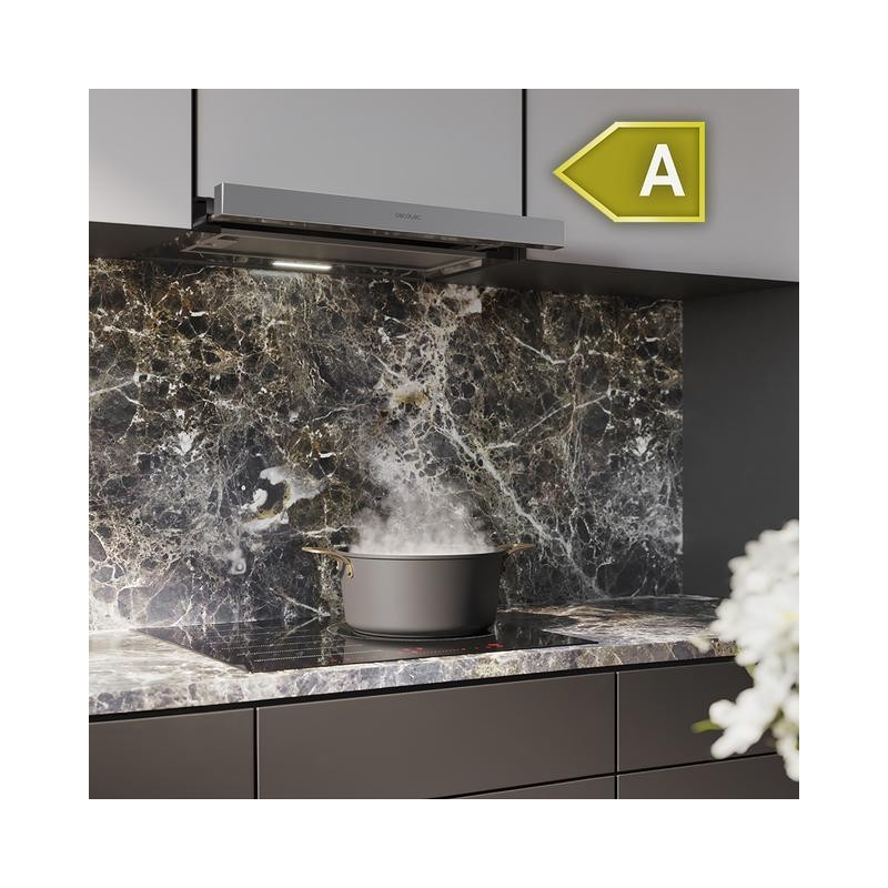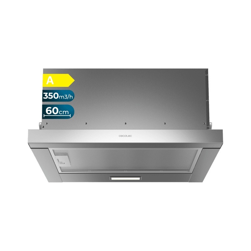 Cecotec Bolero Flux TLM 603500 Inox A. Máxima capacidad de extracción: 350 m³/h, Tipo de extracción: Canalizado/Recirculación, Clasificación eficiencia dinámica de fluidos: C. Tipo: Semintegrada (extraíble), Color del producto: Acero inoxidable. Tipo de filtro de grasa: Aluminio/Carbono, Número de capas del filtro: 3 pieza(s). Potencia de bombilla: 2 W, Tipo de bombilla: LED, Iluminancia: 79 lx. Clase de eficiencia de energía: A, Consumo de energía anual: 22,3 kWh, Escala de eficiencia energética: A+++ a D