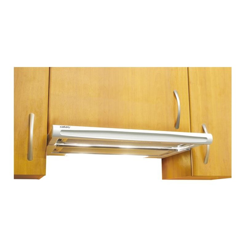 CATA TF-2003. Máxima capacidad de extracción: 350 m³/h, Tipo de extracción: Recirculación, Nivel de ruido: 44 dB. Tipo: Telescópica o extraplana, Color del producto: Plata, Tipo de control: Giratorio. Potencia de bombilla: 40 W, Número de bombillas: 2 bombilla(s). Potencia del motor: 80 W. Ancho: 600 mm, Profundidad: 440 mm, Altura: 140 mm