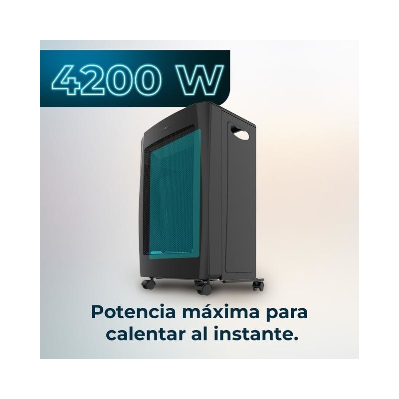 Cecotec ReadyWarm. Tipo de instalación: Independiente, Color del producto: Negro, Tipo de control: Giratorio. Tipo de combustible: Gas natural, Aporte de calor (nominal): 4,2 kW, Aporte de calor (reducido): 1,6 kW. Potencia: 4200 W