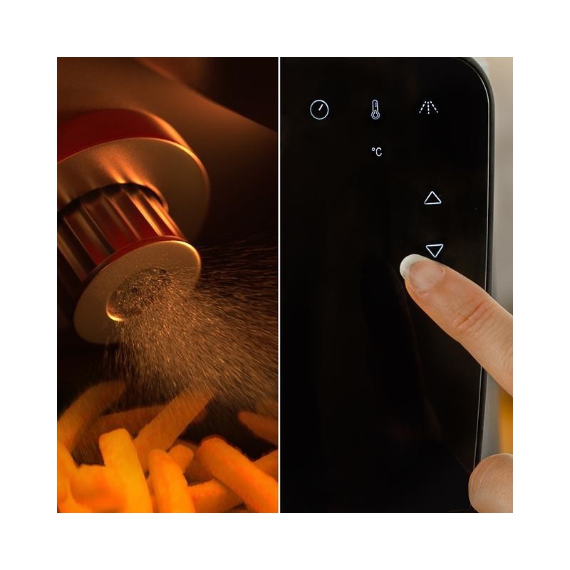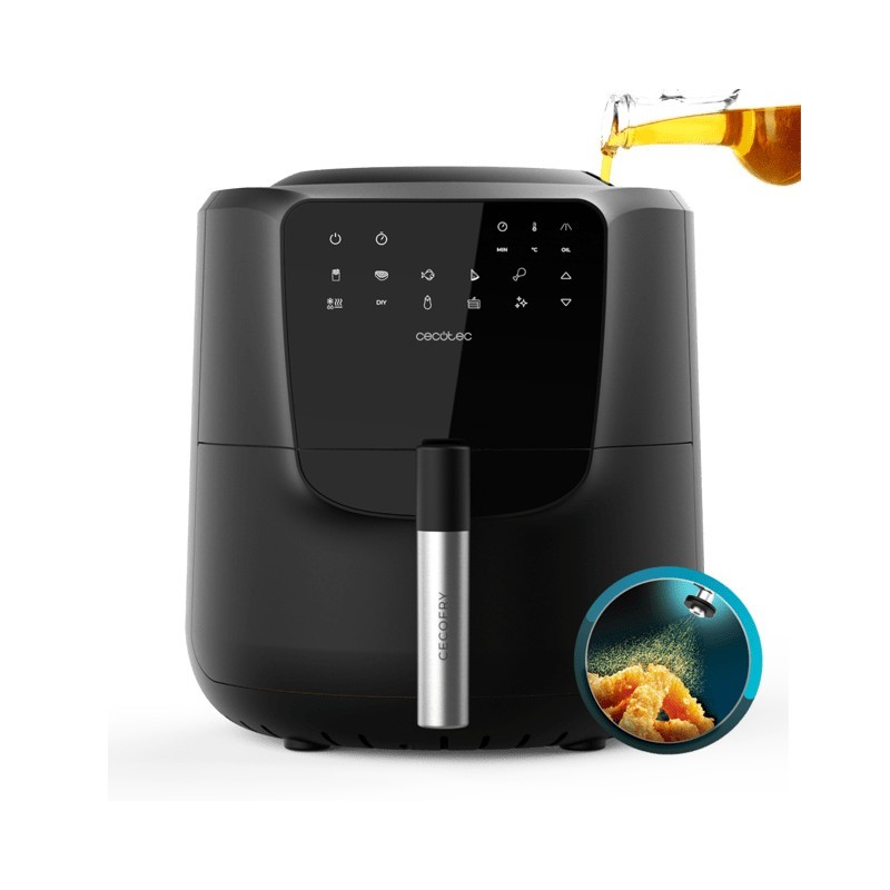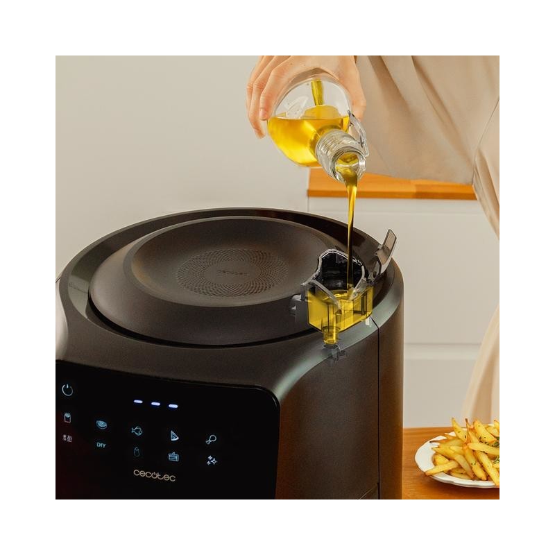 Dosificador de aceite automático.Olvídate de cuánto aceite echar. Ahora solo tienes que rellenar la cubeta dosificadora, elegir entre sus 7 niveles y el autodosificador pulverizará el aceite de manera automática para que cada elaboración salga a su punto perfecto.