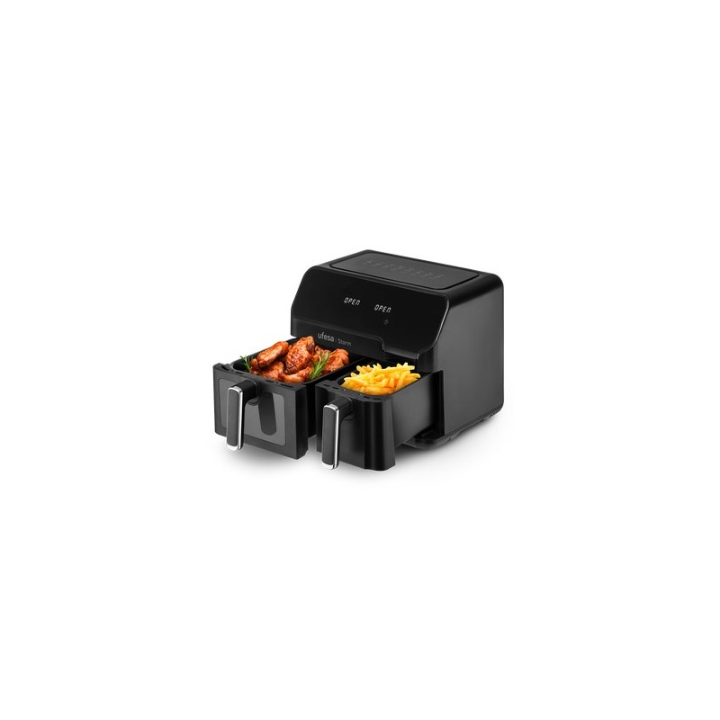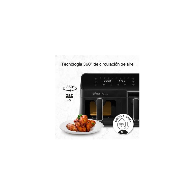 Ufesa Storm. Tipo de producto: Freidora de aire caliente, Capacidad: 9 L, Temperatura (min): 60 °C. Tipo de construcción: Doble, Color del producto: Negro, Tipo de control: Tocar. Potencia: 1700 W. Ancho: 385 mm, Profundidad: 330 mm, Altura: 330 mm. No contiene: Bisfenol A (BPA), Ácido perfluorooctanoico (PFOA)