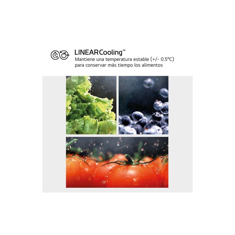 | Tecnologías LG (almacenamiento de alimentos) | DoorCooling+™, Fresh Zone, Frost Free Freezer, Ice Dispenser, LINEARCooling™, Multi-Air Flow, NatureFRESH™, NatureFRESH™ with DoorCooling+™, NatureFRESH™ with Linear Cooling™, Slim SpacePlus® Ice System, Smart Diagnosis, Smart Inverter Compressor™, ThinQ, Total No Frost, UVNano™ |
