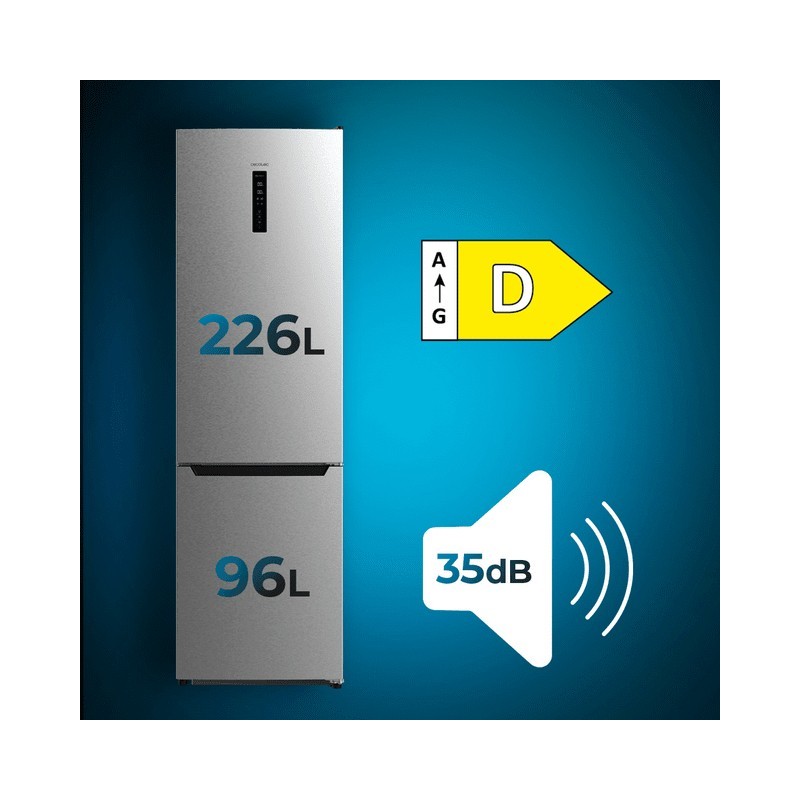 Cecotec 02423. Capacidad neta total: 322 L. Bisagra para puerta: Derecho. Clase climática: SN-T, Nivel de ruido: 35 dB. Frigorífico, capacidad neta: 226 L, Antiescarcha (nevera), Sistema multi-flujo de aire (nevera), Luz interior de la nevera. Congelador, capacidad neta: 96 L, Capacidad de congelación: 6 kg/24h, Antiescarcha (congelador). Compartimiento de zona fresca. Clase de eficiencia de energía: D, Consumo de energía anual: 195 kWh. Color del producto: Acero inoxidable