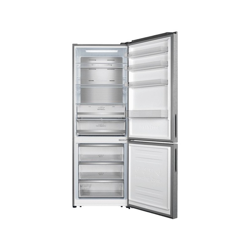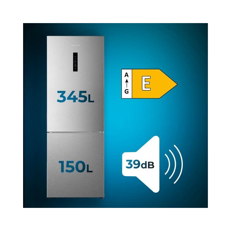 Cecotec 02519. Capacidad neta total: 495 L. Bisagra para puerta: Derecho. Clase climática: SN-ST, Nivel de ruido: 39 dB. Frigorífico, capacidad neta: 345 L, Antiescarcha (nevera), Sistema multi-flujo de aire (nevera), Luz interior de la nevera, Frigorífico, número de compartimentos: 3. Congelador, capacidad neta: 150 L, Capacidad de congelación: 18 kg/24h, Antiescarcha (congelador). Clase de eficiencia de energía: E, Consumo de energía anual: 298 kWh. Color del producto: Acero inoxidable
