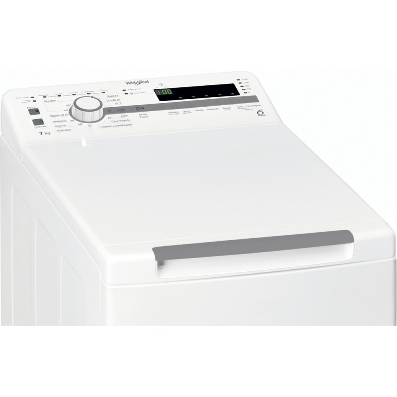 Whirlpool TDLR 7220SS SP/N. Tipo de carga: Carga superior. Capacidad nominal: 7 kg, Clase de secado por giro: C, Nivel de ruido (spin): 78 dB, Máxima velocidad de centrifugado: 1200 RPM. Color del producto: Blanco. Ancho: 400 mm, Profundidad: 600 mm, Altura: 900 mm. Clase de eficiencia de energía: E