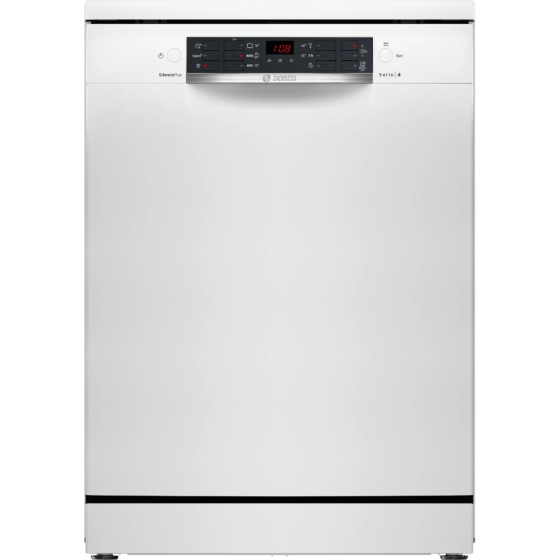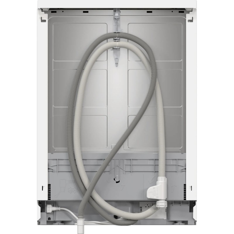 Bosch Serie 4 SMS46KW02E. Tipo de instalación: Independiente, Talla del producto: Tamaño completo (60 cm), Color de la puerta: Blanco. Número de cubiertos: 13 cubiertos, Clase de emisión de ruido: C, Nivel de ruido: 46 dB. Ajuste de patas: 2 cm. Clase de eficiencia de energía: E, Consumo de agua por ciclo de lavado: 9,5 L, Consumo de energía por 100 ciclos: 94 kWh. Ancho: 600 mm, Profundidad: 600 mm, Altura: 850 mm