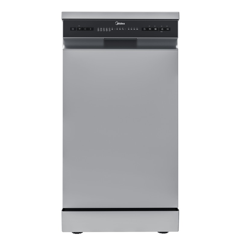 Midea MDWEF1034CSS-WG-EU. Tipo de instalación: Independiente, Talla del producto: Estrecho (45 cm), Color de la puerta: Plata. Número de cubiertos: 10 cubiertos, Clase de emisión de ruido: C, Nivel de ruido: 49 dB. Clase de eficiencia de energía: E, Consumo de agua por ciclo de lavado: 9 L, Consumo de energía por 100 ciclos: 76 kWh. Ancho: 448 mm, Profundidad: 600 mm, Altura: 845 mm. Ancho del paquete: 495 mm, Profundidad del paquete: 645 mm, Altura del paquete: 890 mm