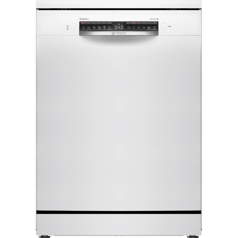 Bosch Serie 6 SMS6ZCW10E. Tipo de instalación: Independiente, Talla del producto: Tamaño completo (60 cm), Color de la puerta: Blanco. Número de cubiertos: 14 cubiertos, Clase de emisión de ruido: B, Nivel de ruido: 40 dB. Aplicaciones de control compatibles: Bosch Home Connect. Clase de eficiencia de energía: B, Consumo de agua por ciclo de lavado: 9 L, Consumo de energía por 100 ciclos: 65 kWh. Ancho: 600 mm, Profundidad: 600 mm, Altura: 845 mm