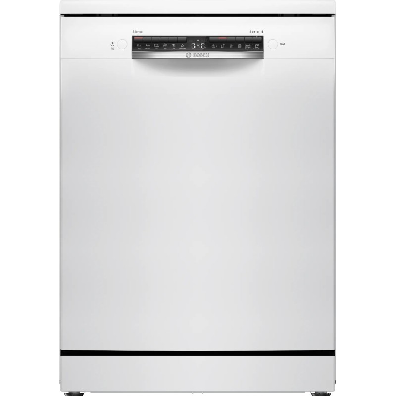 Bosch Serie 4 SMS4HTW03E. Tipo de instalación: Independiente, Talla del producto: Tamaño completo (60 cm), Color de la puerta: Blanco. Número de cubiertos: 13 cubiertos, Clase de emisión de ruido: C, Nivel de ruido: 46 dB. Ajuste de patas: 2 cm, Aplicaciones de control compatibles: Bosch Home Connect. Clase de eficiencia de energía: D, Consumo de agua por ciclo de lavado: 9 L, Consumo de energía por 100 ciclos: 84 kWh. Ancho: 600 mm, Profundidad: 600 mm, Altura: 845 mm