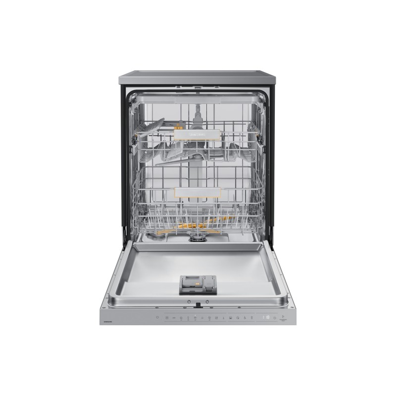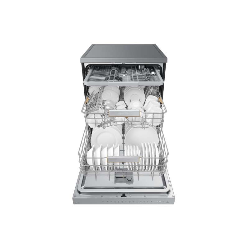 Samsung Lavavajillas Libre instalación 60cm 14 cubiertos Clase A Plata DW60DG790FSLU1. Tipo de instalación: Independiente, Talla del producto: Tamaño completo (60 cm), Color de la puerta: Plata. Número de cubiertos: 14 cubiertos, Clase de emisión de ruido: B, Nivel de ruido: 43 dB. Aplicaciones de control compatibles: SmartThings. Clase de eficiencia de energía: A, Consumo de agua por ciclo de lavado: 9,4 L, Consumo de energía por 100 ciclos: 54 kWh. Ancho: 598 mm, Profundidad: 600 mm, Altura: 845 mm