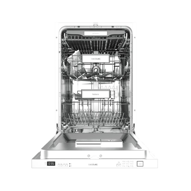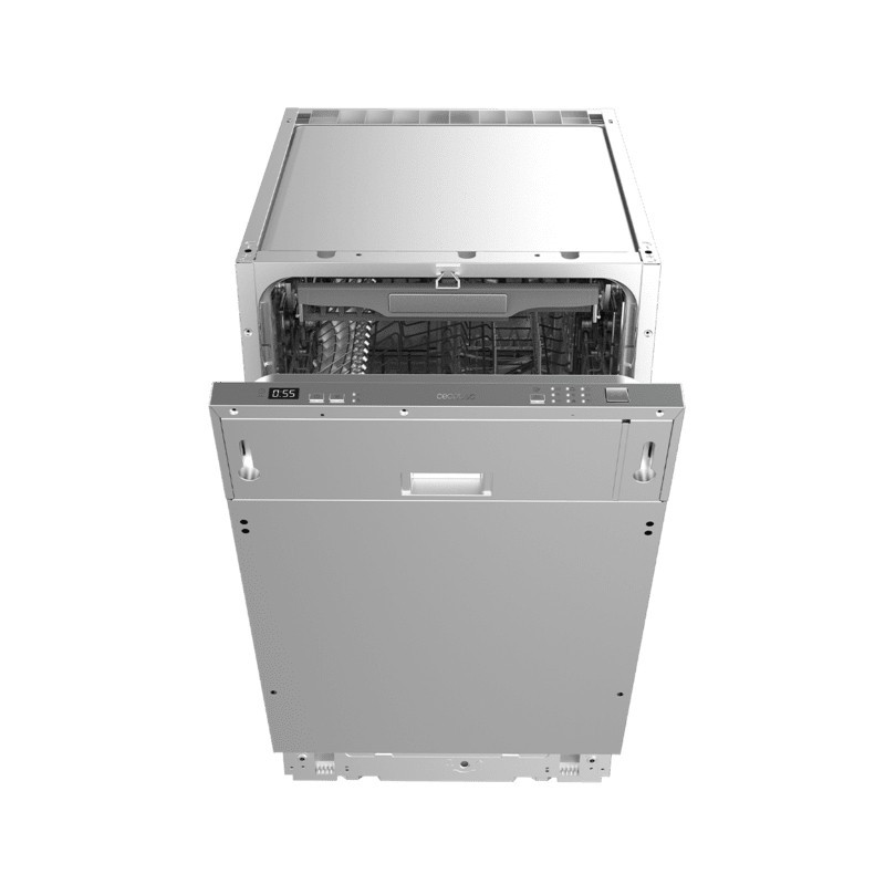 Cecotec 02785. Tipo de instalación: Completamente integrado, Talla del producto: Estrecho (45 cm), Color de la puerta: Acero inoxidable. Número de cubiertos: 11 cubiertos, Clase de emisión de ruido: C, Nivel de ruido: 47 dB. Clase de eficiencia de energía: E, Consumo de agua por ciclo de lavado: 9 L, Consumo de energía por 100 ciclos: 80 kWh. Ancho: 450 mm
