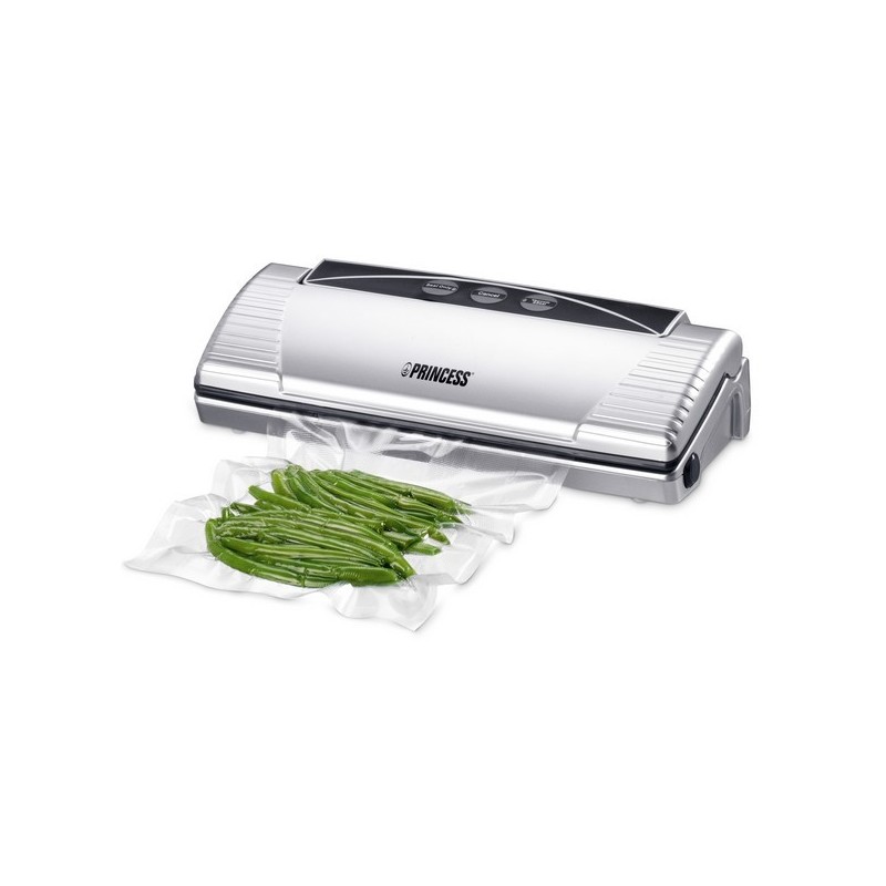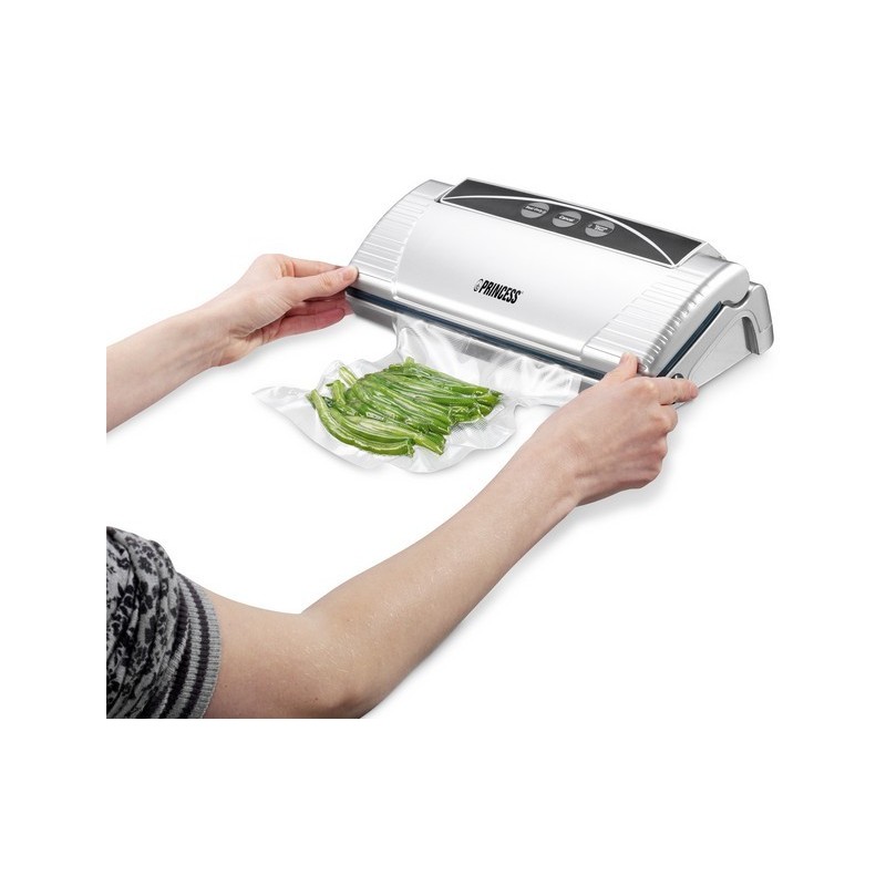 Mantenga la comida fresca más tiempo con la máquina para envasar al vacío Princess 492967 Esta elegante máquina para envasar al vacío aspira y sella la bolsa automáticamente para que no puedan entrar en contacto con la comida el agua o más aire. También puede utilizar la bolsa sellada para cocinar al vacío con la cazuela multiusos Princess 263000.