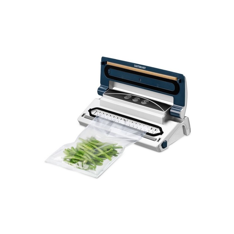 Coloque la bolsa de envasado al vacío de la forma correcta según las instrucciones de la máquina para envasar al vacío y cierre la tapa. Presione con los pulgares en ambos lados de la máquina. La máquina empezará a aspirar todo el aire de la bolsa. Inmediatamente después de terminar este proceso, la máquina sellará la bolsa automáticamente. Deje de hacer presión con los pulgares cuando la bolsa esté totalmente sellada.