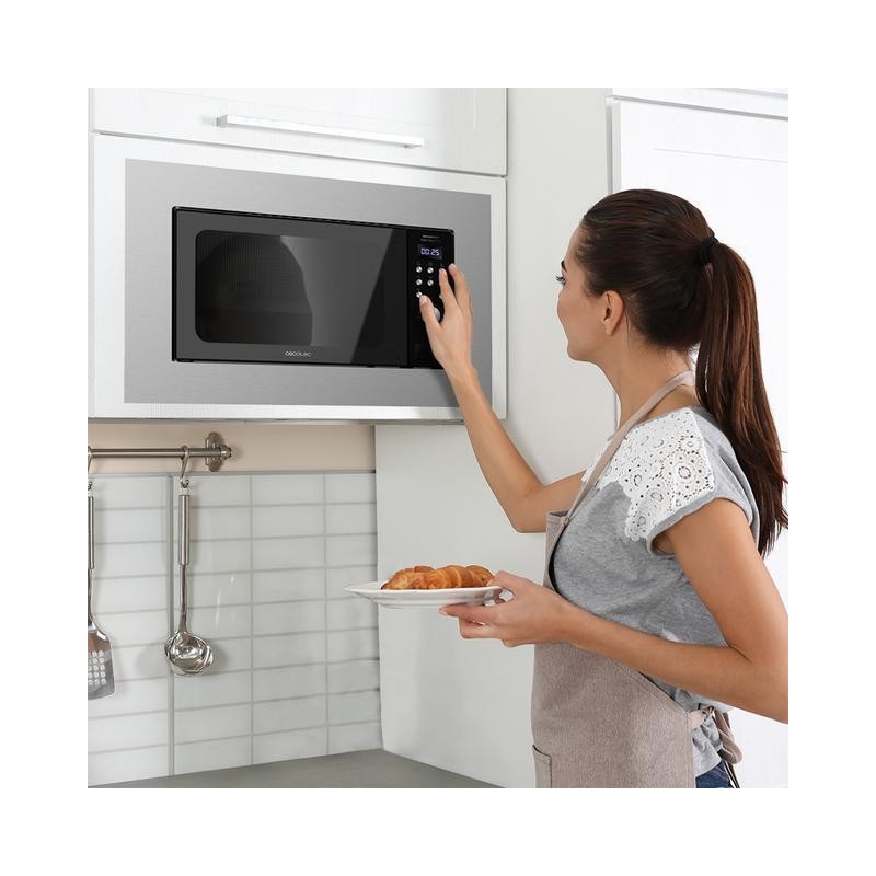Cecotec 01380. Tipo de instalación: Integrado, Tipo de producto: Microondas con grill, Capacidad interior: 20 L, Potencia del microondas: 700 W, Pantalla incorporada, Tipo de control: Botones, Giratorio, Color del producto: Negro, Acero