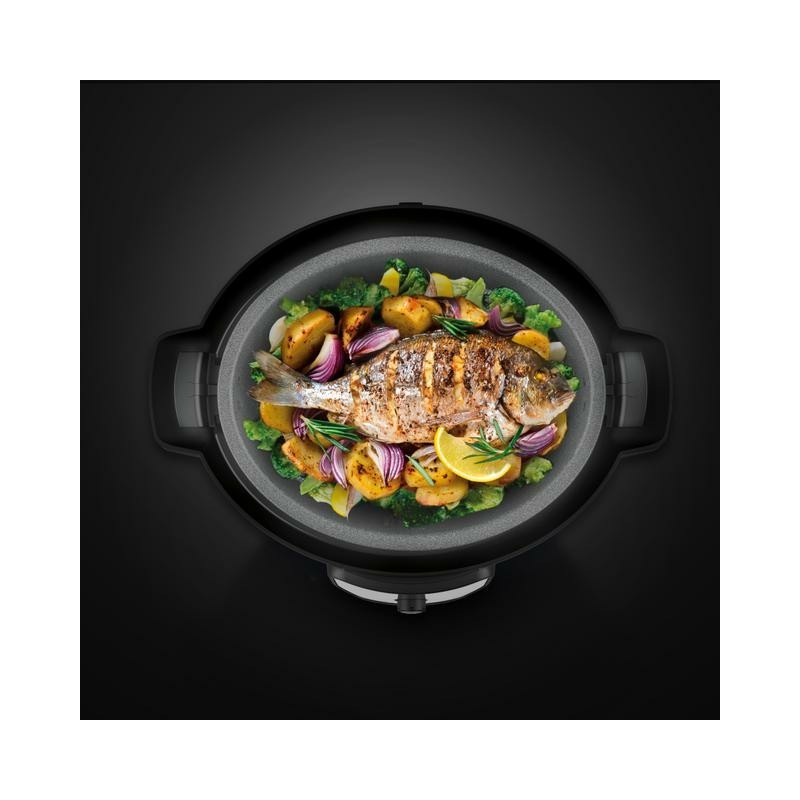 - Forma ovalada para poder cocinar piezas enteras de carne y pescado.