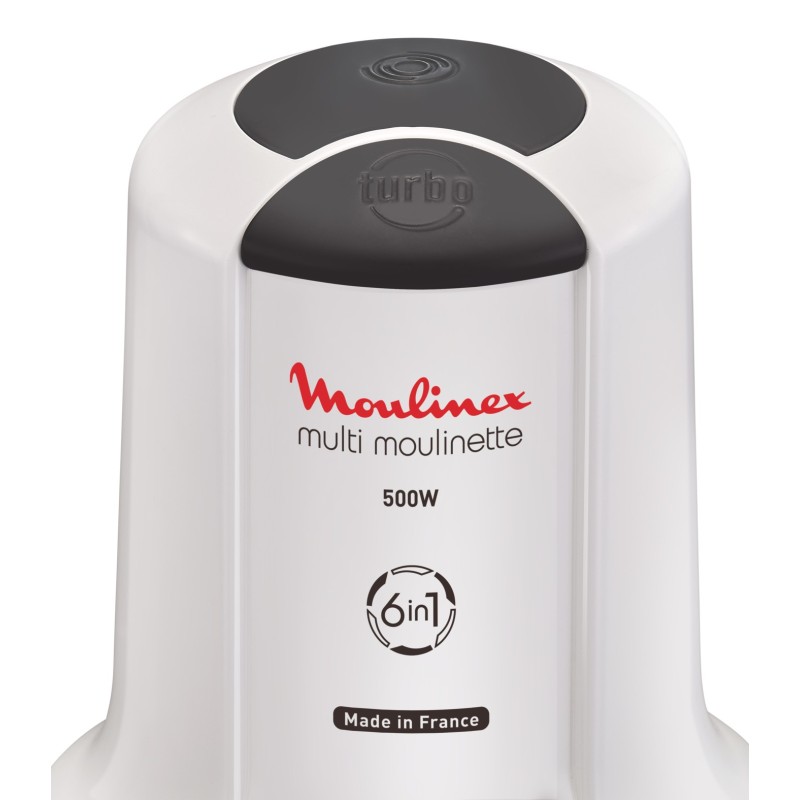 ¡La minipicadora Multi Moulinette es sumamente versátil, reúne todas las funciones que necesitas a diario para picar cualquier ingrediente!Gracias a sus cuchillas exclusivas puedes obtener los resultados esperados en cuestión de segundos: las cuchillas afiladas proporcionan resultados de excelente calidad en hierbas, verduras y carne, mientras que las cuchillas dentadas, junto con el potente motor de 500 W, han sido diseñadas para proporcionar un alto rendimiento a lo largo del tiempo en ingredientes duros como los granos de café y el hielo.