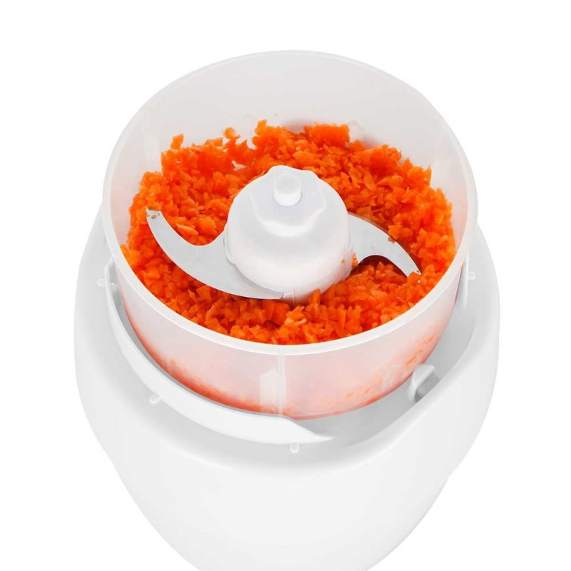 La cuchilla de acero inoxidable extraíble y su potencia de 800 W la convierten en un asistente de cocina ágil y eficaz. En el recipiente transparente con capacidad de 0,6 litros solo hay que colocar los alimentos, pulsar el interruptor integrado para encendido y apagarlo cuando se considere conveniente.