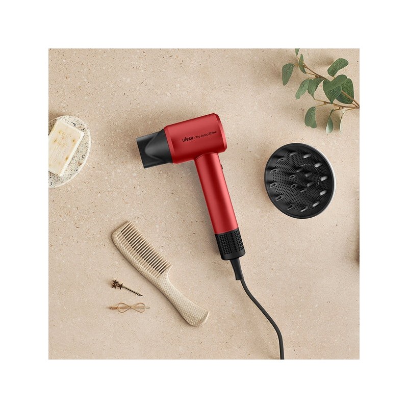 Ufesa Pro Ionic Air. Color del producto: Rojo, Tipo de control: Control deslizante. Potencia: 1600 W. Ancho: 141 mm, Profundidad: 69,5 mm, Altura: 285 mm. Cantidad por paquete: 1 pieza(s)