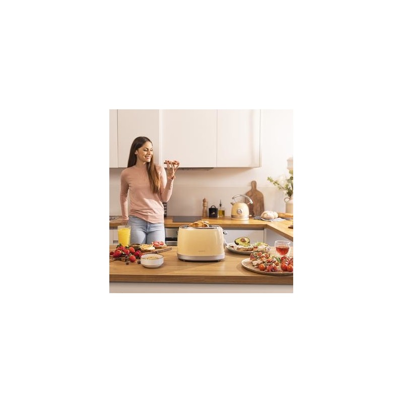 Diseñada para marcar la diferenciaLa tostadora cuenta con un un diseño de acero inoxidable lacado en amarillo con detalles en cromado, perfecto para combinar en tu cocina y darle un toque de estilo.