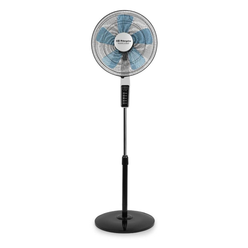 El ventilador de pie Silent Night SF 0642 de Orbegozo cuenta con una potencia de 65 W combinados con sus 5 aspas y 3 velocidades de ventilación que aportan un gran caudal de aire por toda la estancia. Tiene indicadores luminosos de funcionamiento con iluminación LED y sistema de seguridad que impide el acceso a las aspas en funcionamiento. Una de las grandes ventajas de este ventilador de pie es su temporizador de apagado hasta 7,5 horas. Una función muy importante para entregarte al descanso sin preocupaciones. Su altura es regulable, llegando hasta 150 centímetros de altura.
