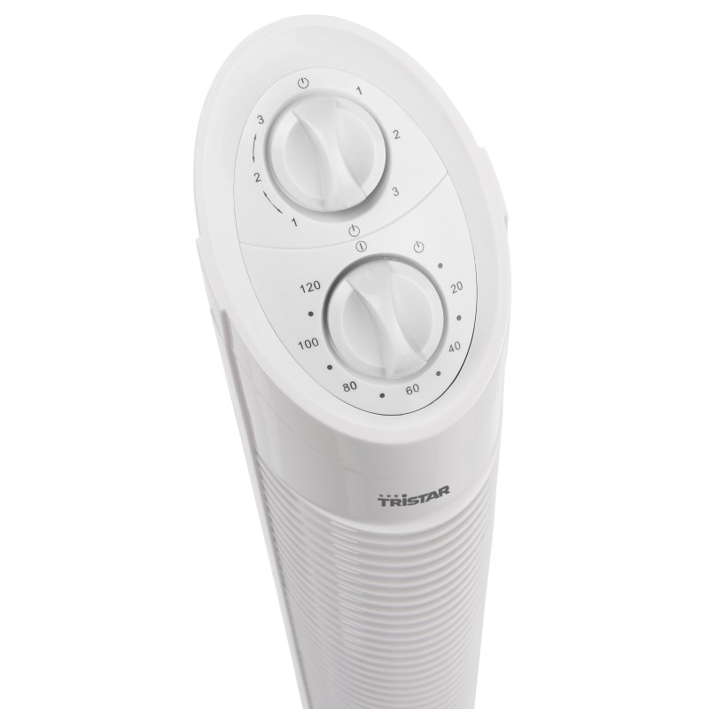 Tristar VE-5905 Torre de ventilación. Tipo: Ventilador tipo torre para el hogar, Color del producto: Blanco, Ubicación: Piso. Alimentación: Corriente alterna, Consumo energético: 30 W, Voltaje de entrada AC: 220 - 240 V. Altura: 730 mm, Peso: 1,7 kg. Ancho del paquete: 170 mm, Profundidad del paquete: 130 mm, Altura del paquete: 750 mm
